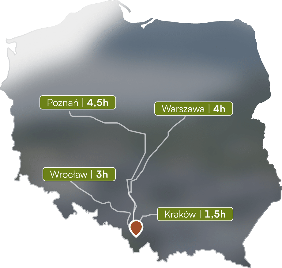 Ośrodki narciarskie: Szczyrk (ok. 20 km) i Wisła (ok. 40 km)