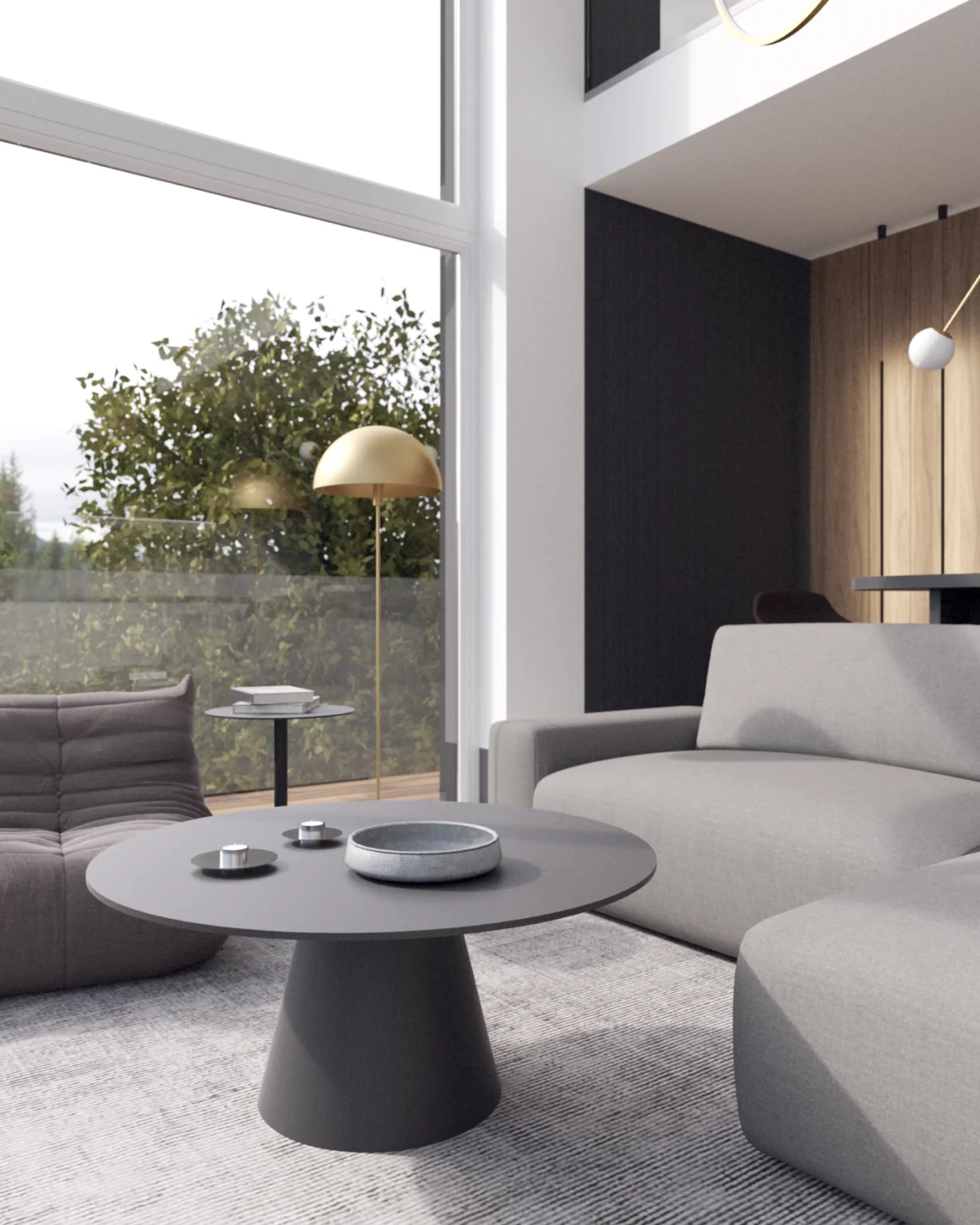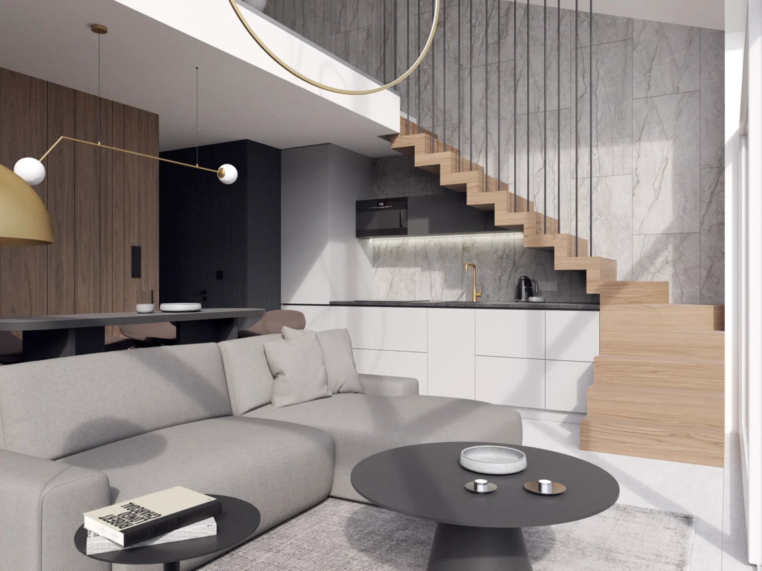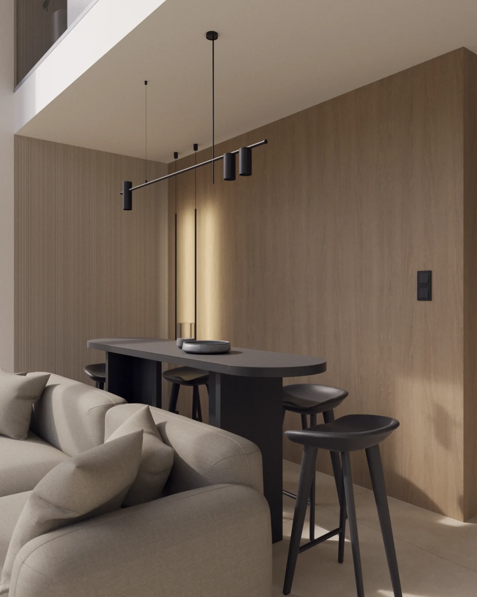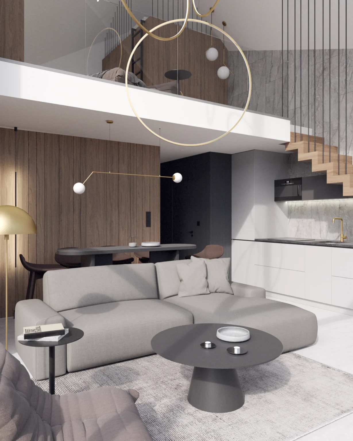 Wnętrza w odcieniach szarości, grafitu i czerni. Nowoczesny minimalizm z industrialnymi akcentami, który łączy chłodną elegancję z naturalnym ciepłem dzięki użyciu drewna i kamienia. Styl skandynawski z nutą nowoczesności..