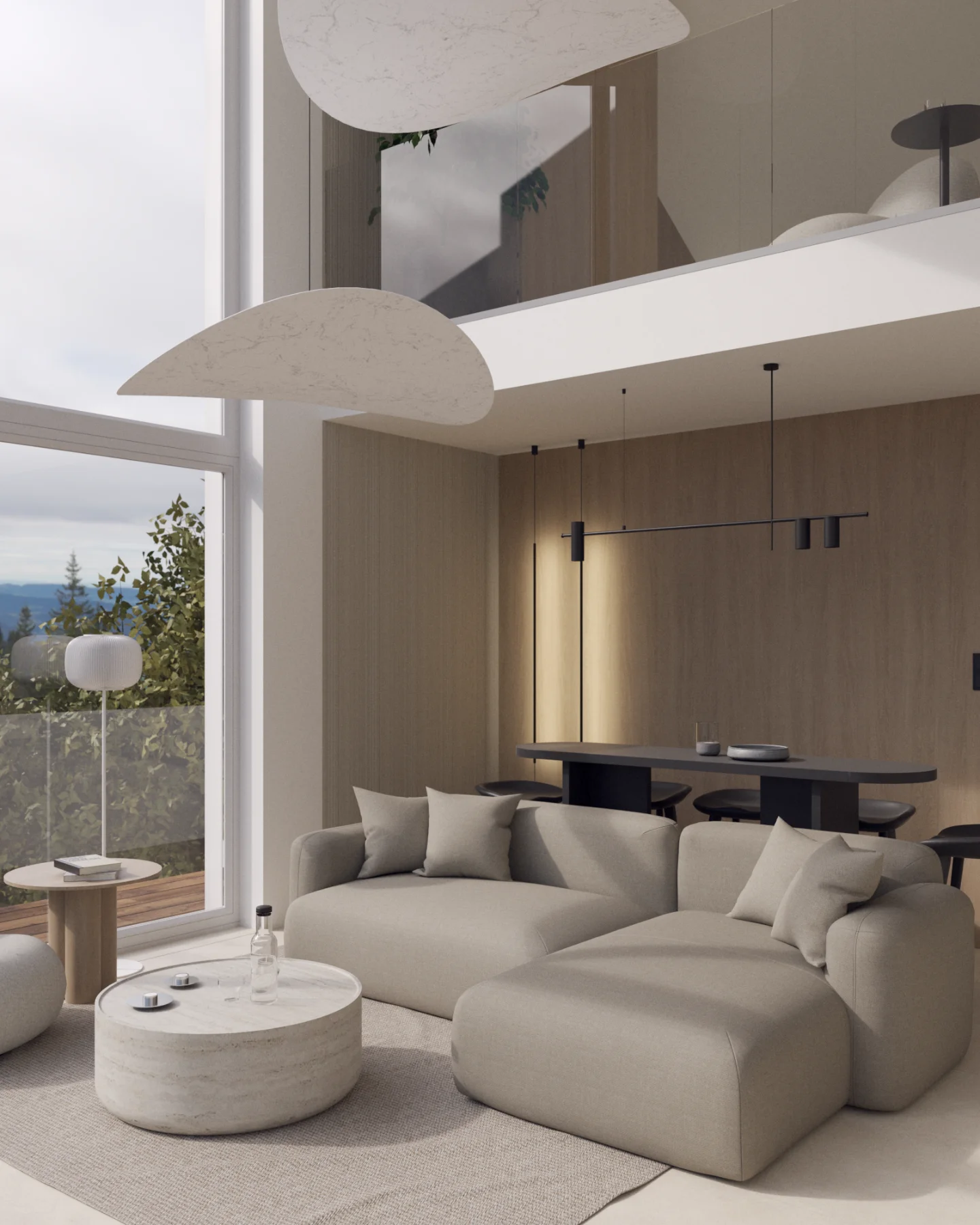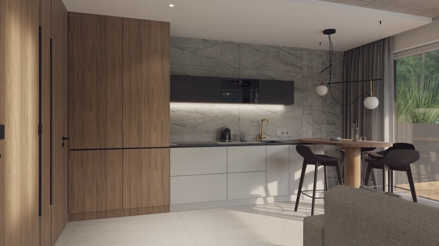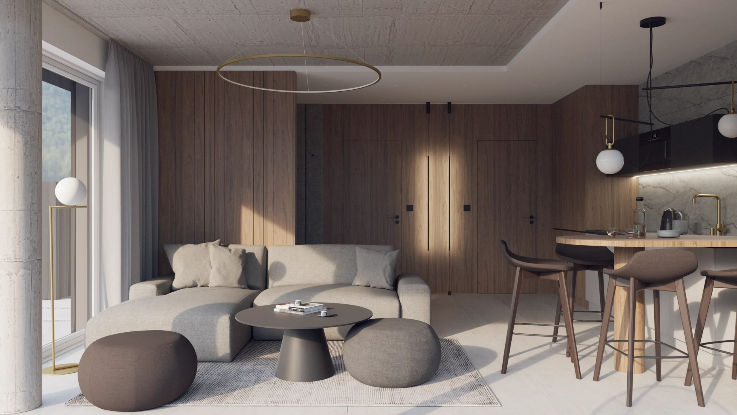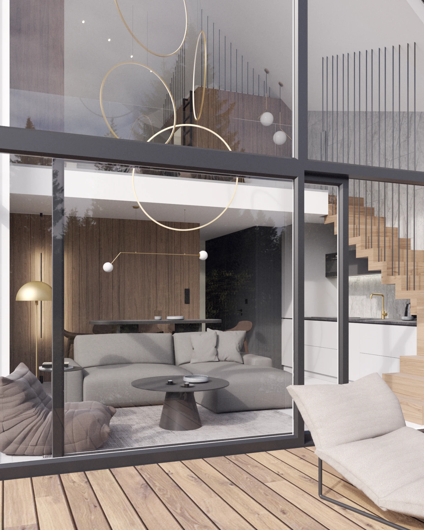 Wnętrza w odcieniach szarości, grafitu i czerni. Nowoczesny minimalizm z industrialnymi akcentami, który łączy chłodną elegancję z naturalnym ciepłem dzięki użyciu drewna i kamienia. Styl skandynawski z nutą nowoczesności..