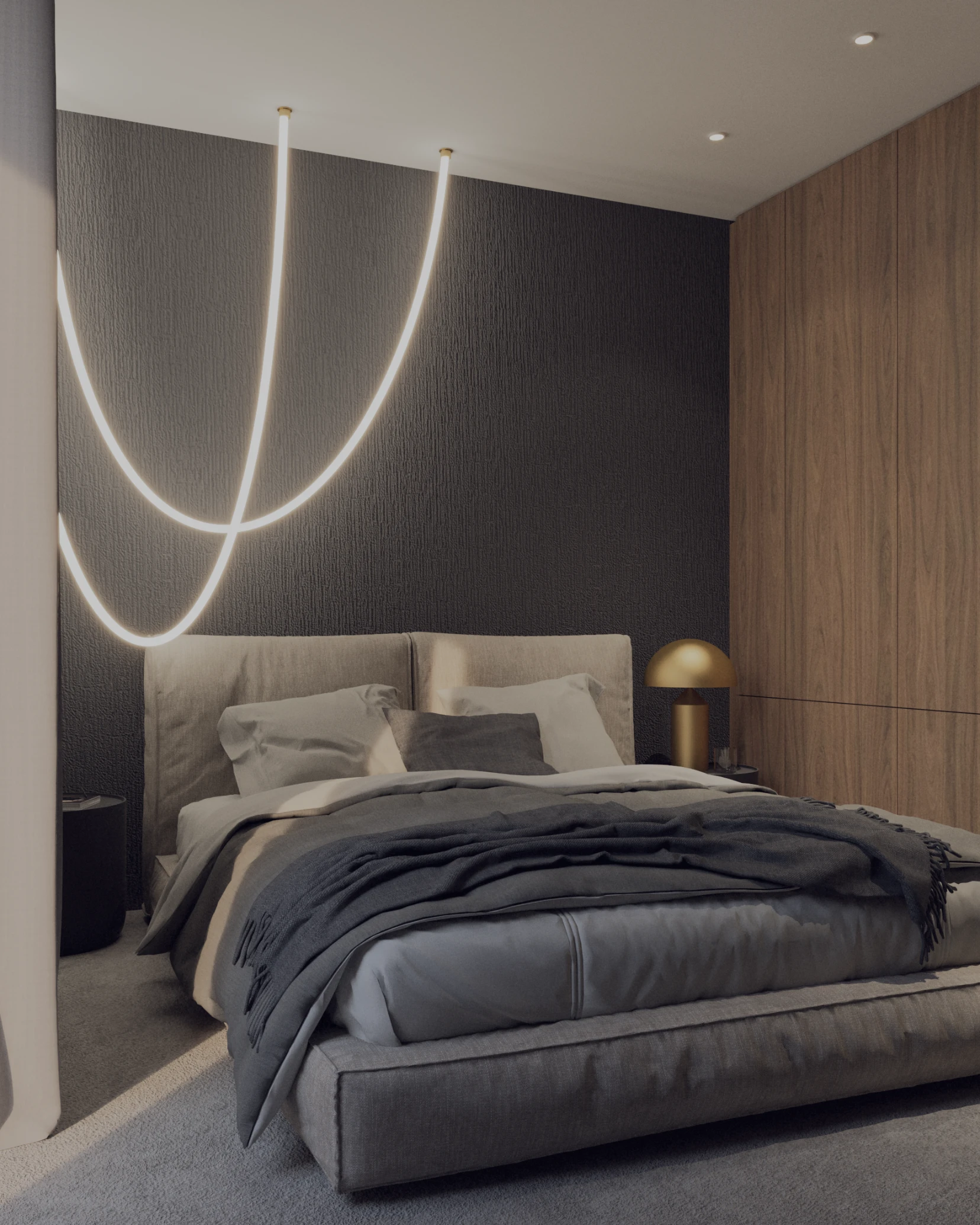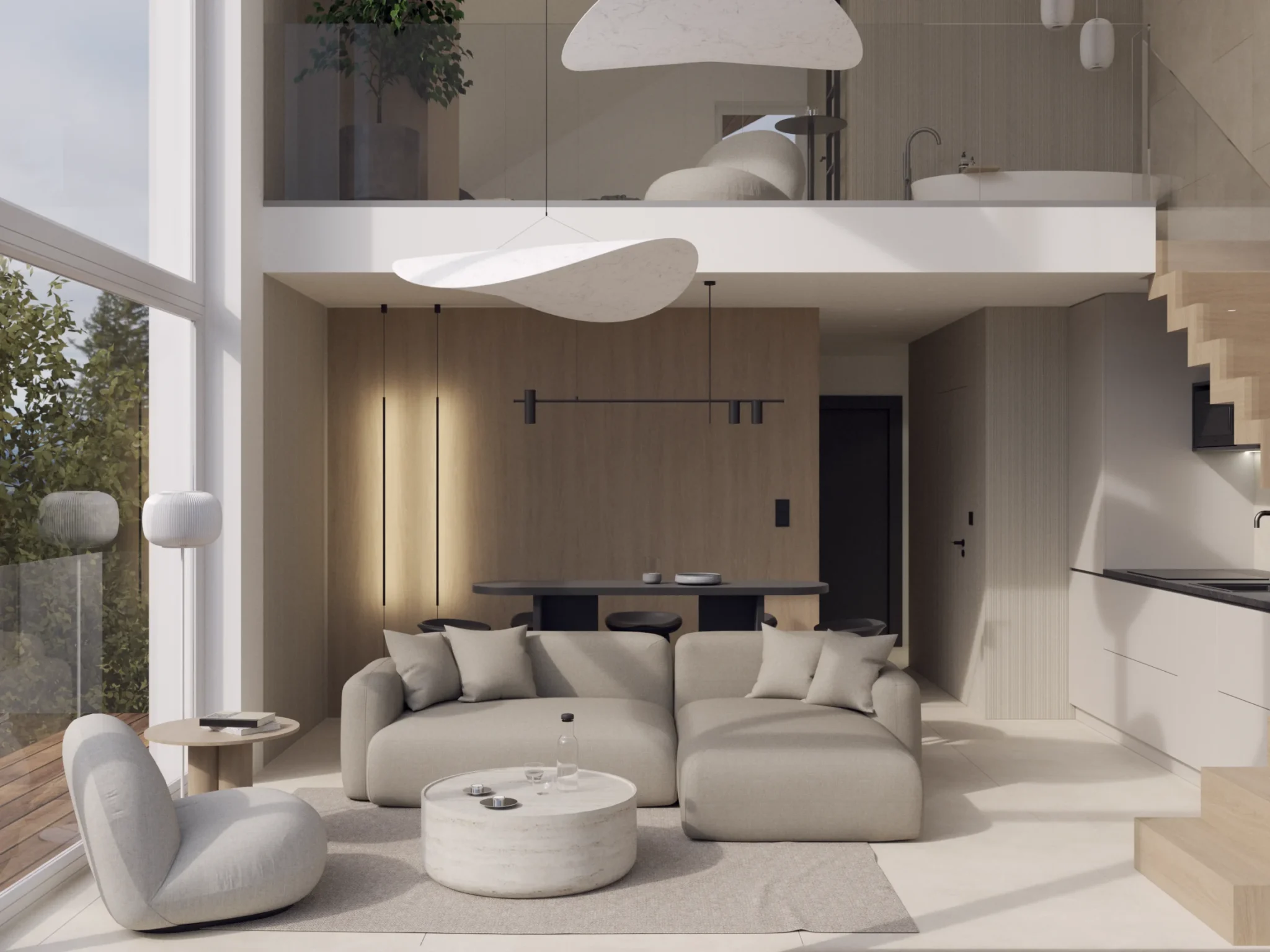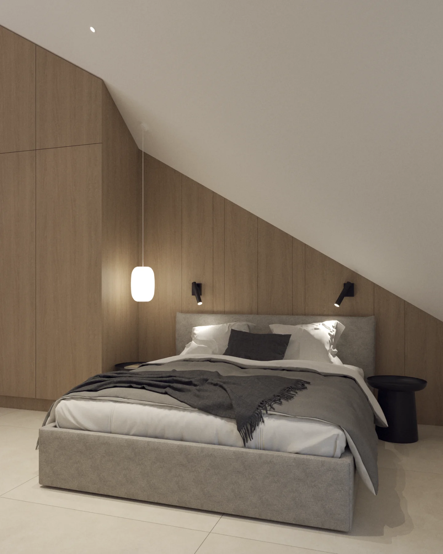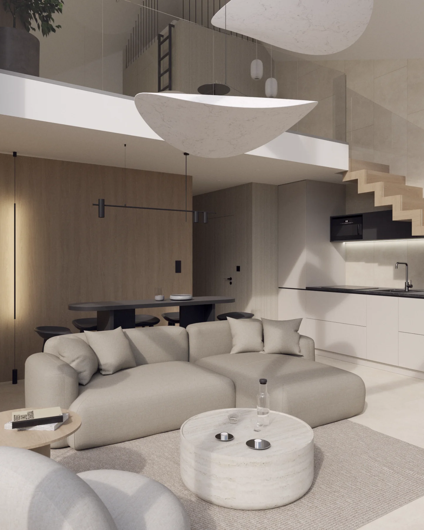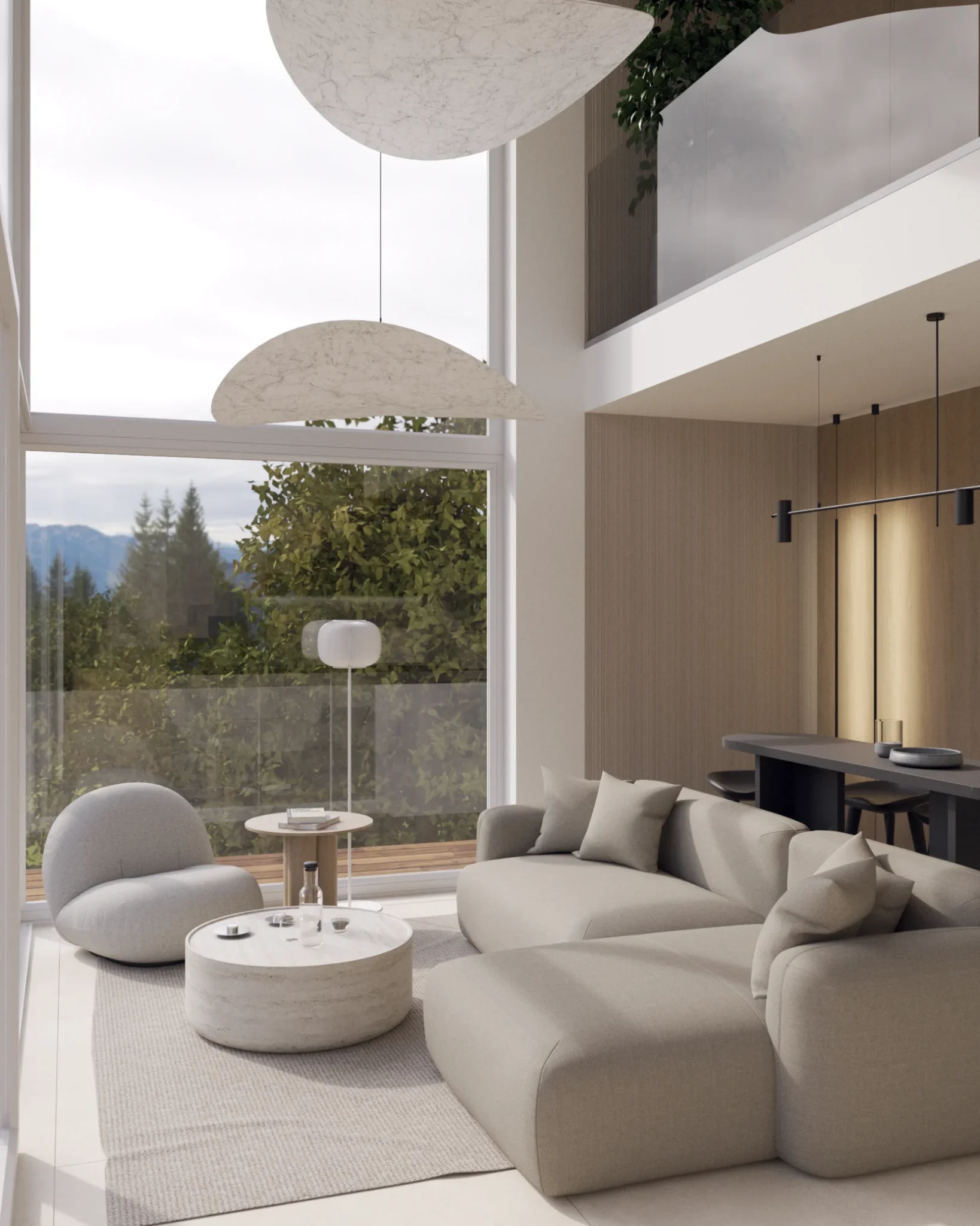 Wnętrza w odcieniach szarości, grafitu i czerni. Nowoczesny minimalizm z industrialnymi akcentami, który łączy chłodną elegancję z naturalnym ciepłem dzięki użyciu drewna i kamienia. Styl skandynawski z nutą nowoczesności..