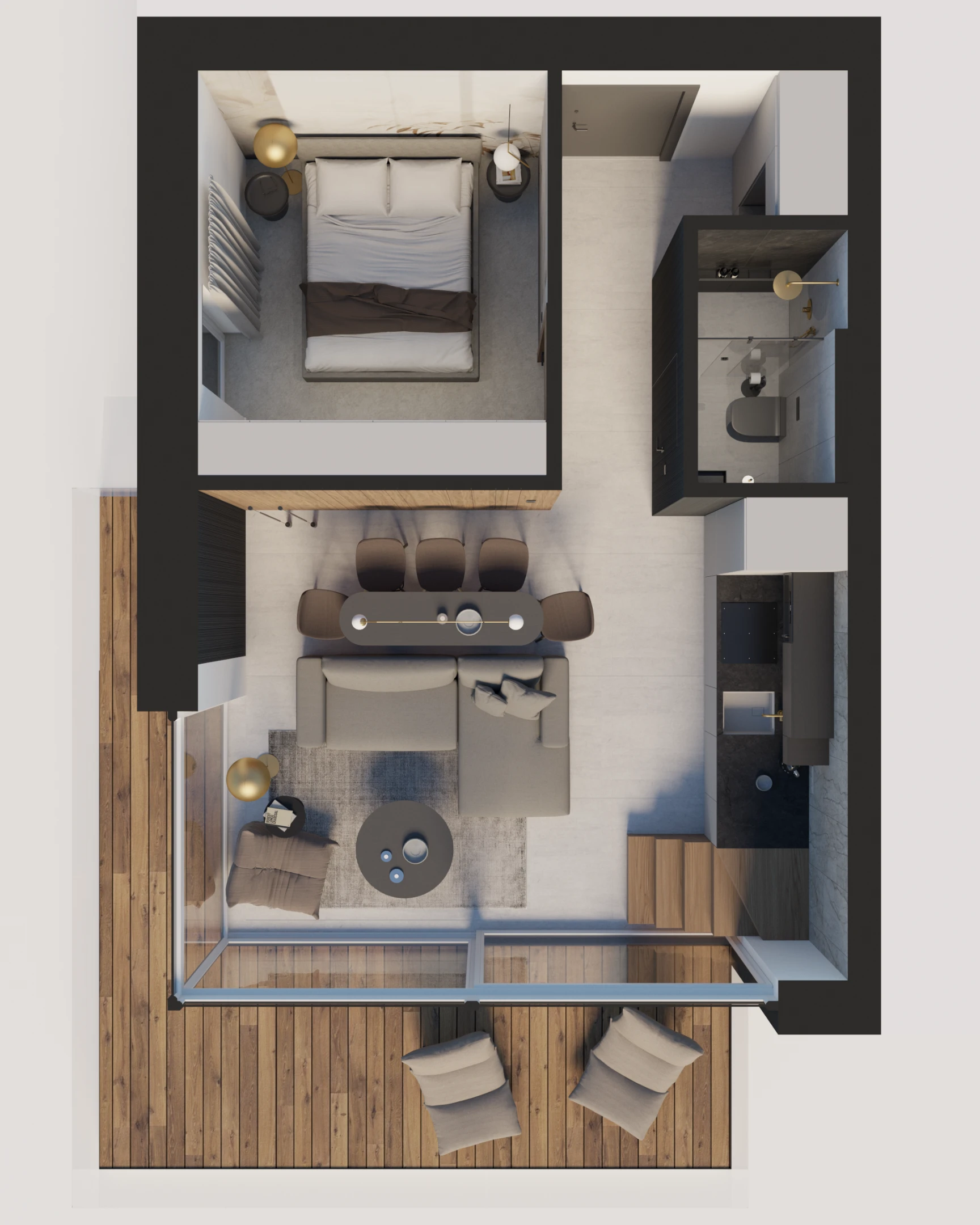 W każdym apartamencie jest klimatyzacja, ogrzewanie podłogowe oraz kompleksowe umeblowanie.