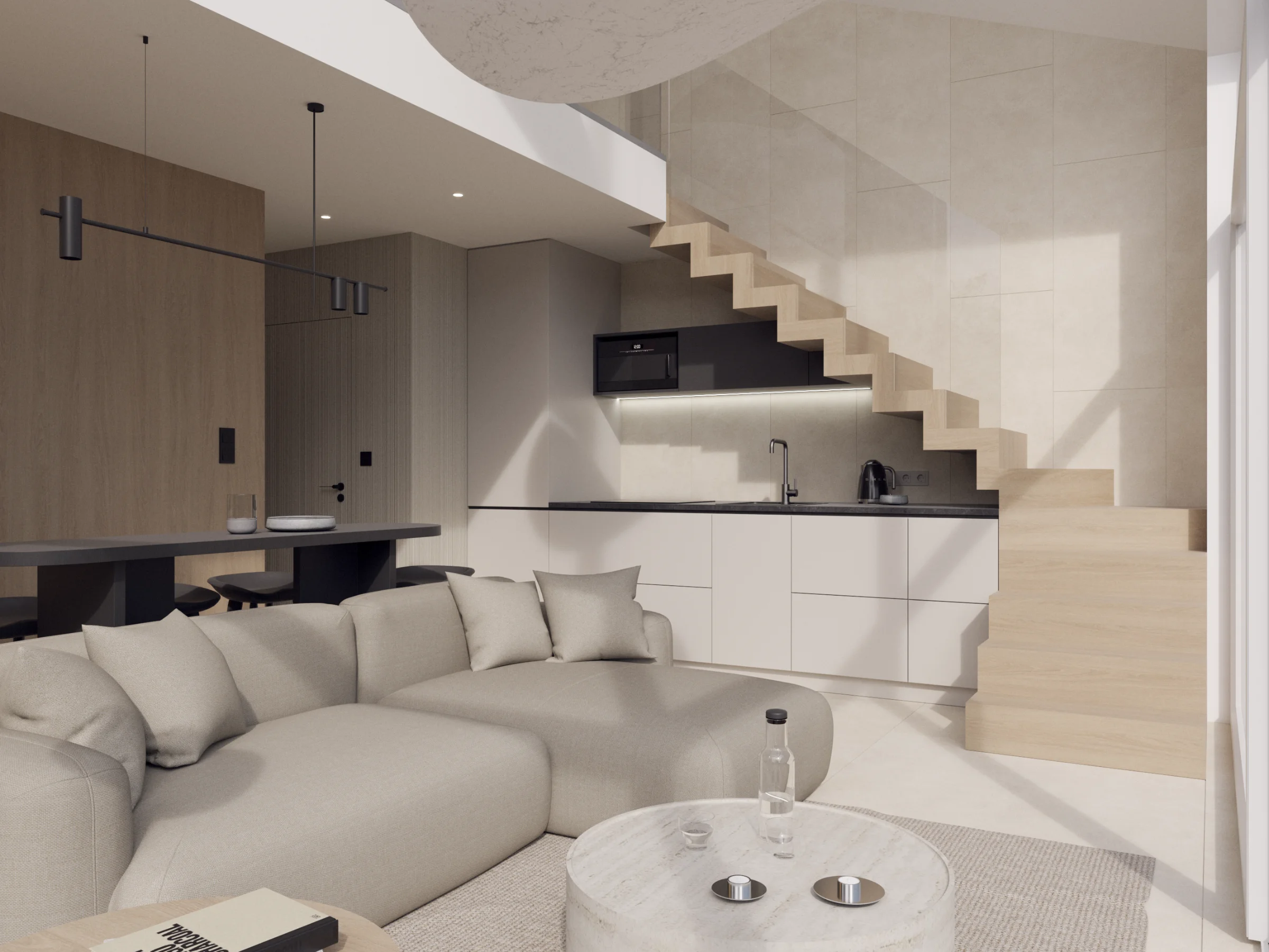 Ciepłe beże i brązy nawiązujące do naturalnego otoczenia. Przytulne wnętrze w stylu boho z rustykalnym akcentem. Jasna stolarka meblowa, naturalny kamień, gresy i marmury tworzą harmonię z naturą.